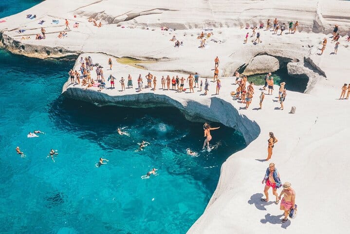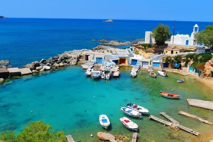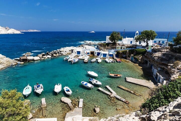 Visit Mandrakia, a postcard-perfect fishing village famous for its colorful boat garages carved into the rocks, before heading to Sarakiniko, Milos’ most famous beach, renowned for its dramatic white volcanic formations and lunar-like landscape. Enjoy free time to explore or swim.