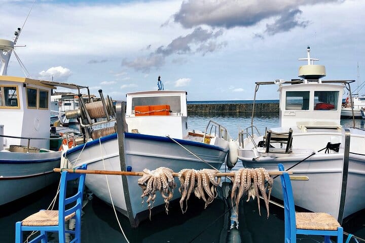 Continue to the seaside village of Alyki, in the island’s southern part. By the water’s edge, indulge in a selection of traditional meze and fresh seafood specialties, including the island’s famous sun-dried mackerel, for an authentic taste of Parian gastronomy.