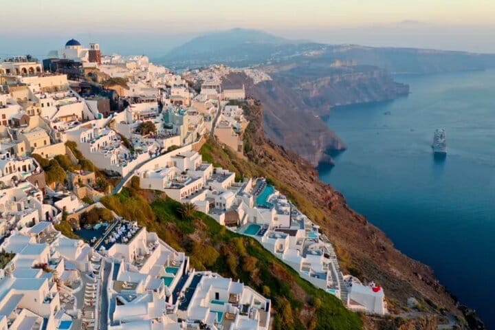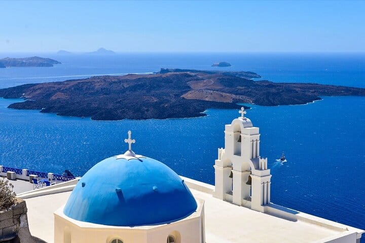 Next, discover Firostefani, a charming caldera-side village. From the famous Three Bells viewpoint, capture postcard-perfect shots of the volcanic islets and sweeping views of Santorini’s dramatic cliffs.