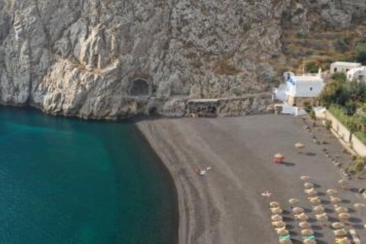 Finally, unwind at Perivolos Black Sand Beach Santorini’s most unique gems. Relax in crystal clear waters, sip a refreshing drink, or enjoy a farm to table lunch right by the sea.